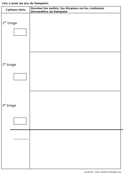 - grille à compléter du jeu du banquier suivant des tirages donnés en passant par la représentation (dessiner chaque tirage puis trouver le résultat final)