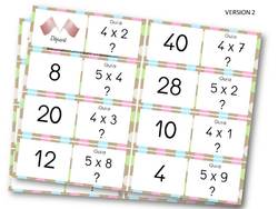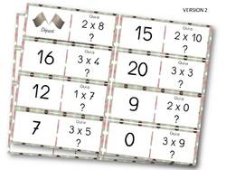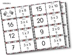Règle du jeu : Distribuer un ou deux « dominos » par élève (l’élève ayant le domino départ doit avoir deux dominos). L’élève qui a le domino « départ » commence et lit sa question : Qui a 4 x 2 = ? Le premier à annoncer « Moi ! 8 ! » a le droit de poser sa question à son tour. Et ainsi de suite jusqu’au domino « arrivée».